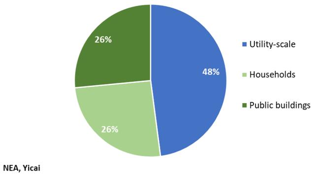 大多數(shù)今年安裝的太陽(yáng)能發(fā)電裝置來(lái)自于小型項(xiàng)目,這些項(xiàng)目將太陽(yáng)能板置于公共建筑和私人住宅的屋頂上。2021年7月,國(guó)家能源局要求至少一半的政府辦公樓、40%的學(xué)校和醫(yī)院、30%的商業(yè)和工業(yè)建筑,以及20%的農(nóng)村住宅安裝太陽(yáng)能電池板。