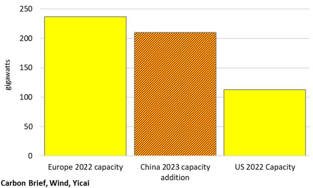 預(yù)計(jì)中國(guó)今年的太陽(yáng)能發(fā)電量將增加210千兆瓦(圖3),接近美國(guó)2022年產(chǎn)能的兩倍,約為歐洲2022年產(chǎn)能的90%。