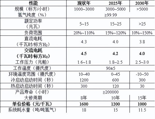 堿性電解槽主要成本構(gòu)成為電解電堆組件(45%)和系統(tǒng)輔機(55%);電解槽成本中55%是膜片及膜組件。依據(jù)行業(yè)內(nèi)多家主流廠商的數(shù)據(jù)分析,堿性電解槽的2025年及2030年的主要技術(shù)參數(shù)和投資水平如下: