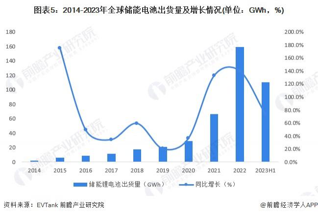 全球電化學儲能裝機規(guī)模的持續(xù)上漲帶動儲能電池出貨量上漲,根據 EVTank 披露的數(shù)據,2014-2022 年,全球儲能電池 ( 主要為儲能鋰離子電池 ) 出貨量增長速度較快,2022 年,全球儲能鋰離子電池總體出貨量為 159.3GWh,同比增長 140.3%。2023 年上半年,全球儲能電池出貨量達到 110.2GWh,同比增長 73.4%,