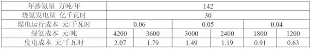 假設(shè)實(shí)現(xiàn)約70%的摻氨比例,經(jīng)計(jì)算每年需氨量約1440萬(wàn)噸,制氨用電量約1300億千瓦時(shí)。則制氨所需風(fēng)電裝機(jī)約2100萬(wàn)千瓦、光伏裝機(jī)約4200萬(wàn)千瓦、制氫+合成氨裝置約3250萬(wàn)千瓦,建設(shè)管道7條,預(yù)計(jì)設(shè)備總投資為3760億元。經(jīng)測(cè)算火電摻燒氨帶來的全社會(huì)用電成本上升約0.044元/千瓦時(shí)。