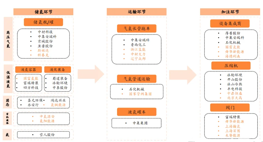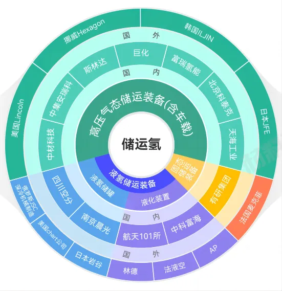 氫能產(chǎn)業(yè)中游主要包括儲運氫和加氫站建設(shè)。儲運氫環(huán)節(jié),主要有高壓氣態(tài)儲氫、低溫液態(tài)儲氫、固體儲氫和有機液體儲氫等方式。當(dāng)前,美國、歐洲已分別建成2600km、1500km的氫管道,而我國氫氣管道里程約400km,在用管道僅有百公里左右。儲運氫環(huán)節(jié)成為我國氫能產(chǎn)業(yè)亟待攻克的環(huán)節(jié)。