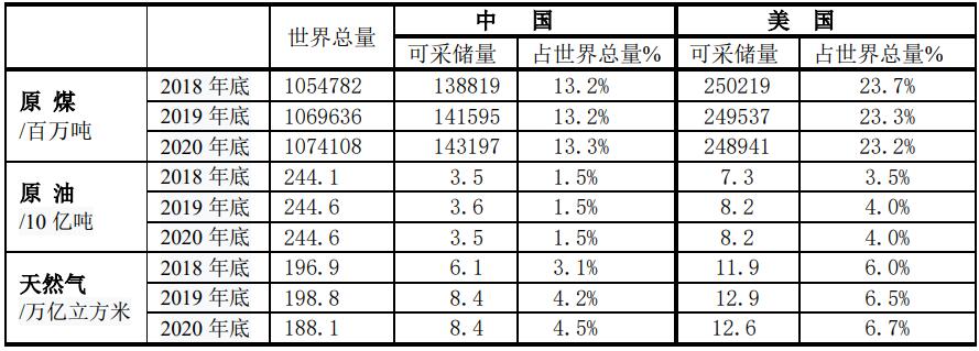 中美兩國化石燃料可采儲量的比較