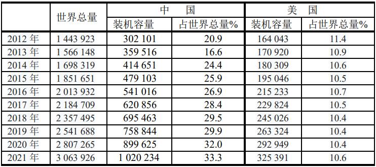 2012~2021年中美兩國再生能源裝機容量(單位:MW)