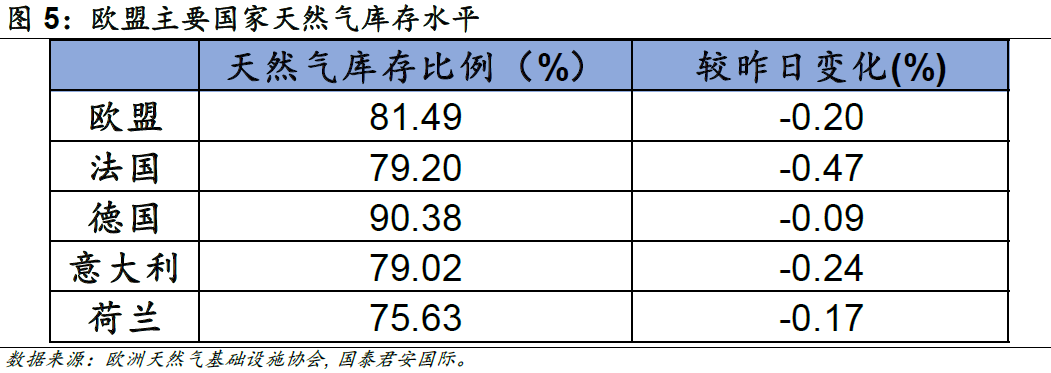 暖冬的到來極大程度上緩解了天然氣消耗的壓力,歐盟的天然氣庫存儲量超過最大儲量的80%,短期內(nèi)天然氣壓力不會顯著回升。歐洲天然氣基礎(chǔ)設(shè)施協(xié)會(GIE)數(shù)據(jù)顯示,截止2023年1月15日,歐盟27國的天然氣儲量超過最大儲量的80%,德國作為最主要的天然氣消耗國,庫存儲量甚至超過90%。暖冬導(dǎo)致對天然氣消耗需求的減少可以在相當程度上緩解整體天然氣需求的壓力,短期來看,天然氣需求壓力不會顯著回升,通脹壓力有望持續(xù)放緩。