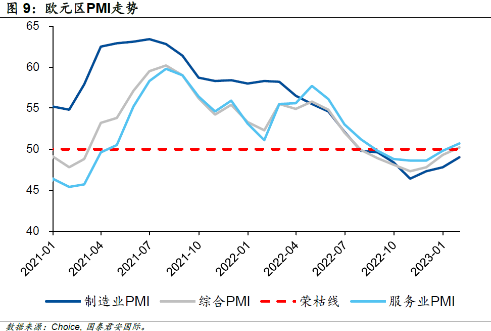 這一系列的政策效果在2022年末開始逐步顯露,歐洲的經(jīng)濟指標開始出現(xiàn)回暖跡象。歐元區(qū)綜合PMI初值及服務(wù)業(yè)PMI初值在2023年1月扭轉(zhuǎn)了約半年的收縮趨勢,回到了榮枯線上方;雖然制造業(yè)PMI仍處于收縮區(qū)間,但是收縮幅度也大幅改善。