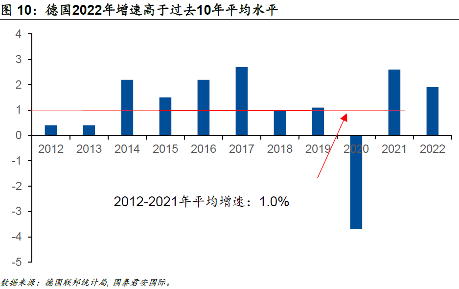 作為歐元區(qū)最大的經(jīng)濟體,近日公布的數(shù)據(jù)顯示,經(jīng)過價格調(diào)整后,德國2022年GDP同比增長1.9%,高于市場預(yù)期1.8%。不可否認的是,俄烏沖突推升的天然氣價格給德國經(jīng)濟造成了相當大的困擾,但是德國2022年GDP依舊增長1.9%,較2019年(新冠疫情開始前一年)高0.7個百分點,亦高于2012年至2021年的十年平均水平(1.0%)。