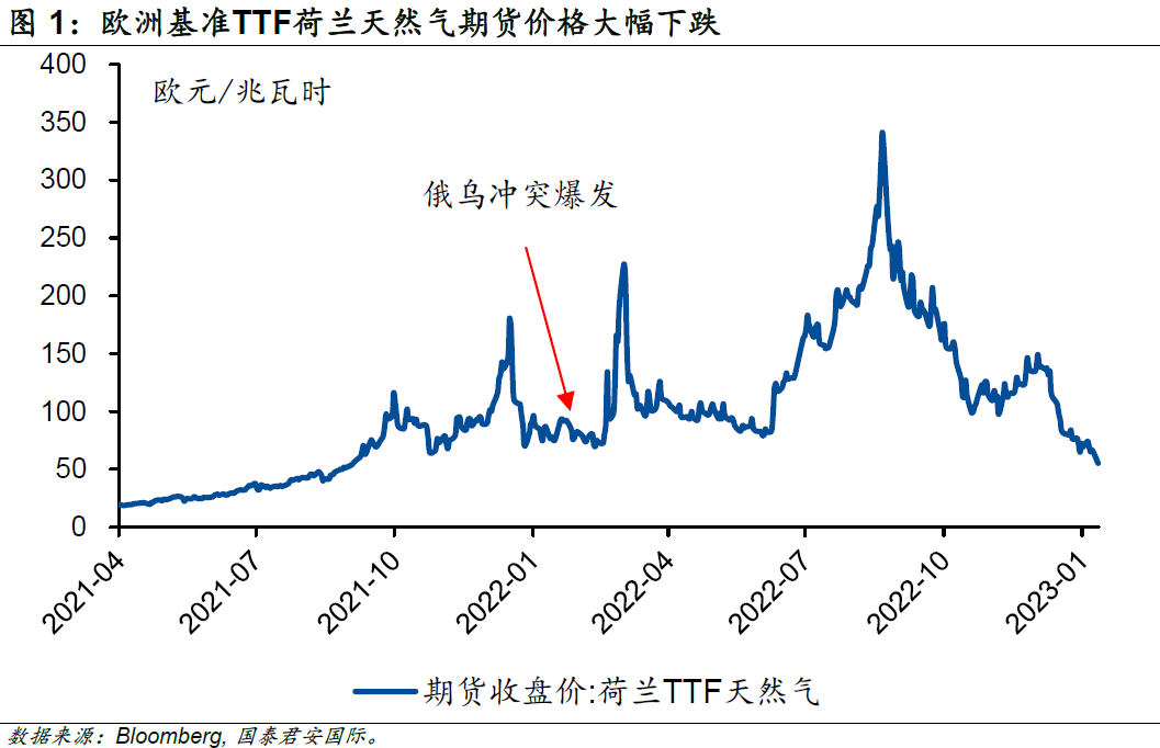 暖冬的到來極大程度上縮減了供熱對天然氣的需求,歐洲基準TTF荷蘭天然氣期貨價格延續(xù)了之前的大幅回落趨勢。截至2023年1月中旬,期貨價格已經(jīng)低于俄烏沖突爆發(fā)前的水平。在天然氣價格走低的情況下,能源價格不應(yīng)該繼續(xù)推動通脹高企;另一方面,隨著中國2023年經(jīng)濟預(yù)期的大幅上修,歐元區(qū)出口有望迎來顯著改善。歐洲2023年的衰退預(yù)期似乎也應(yīng)該畫上一個問號?