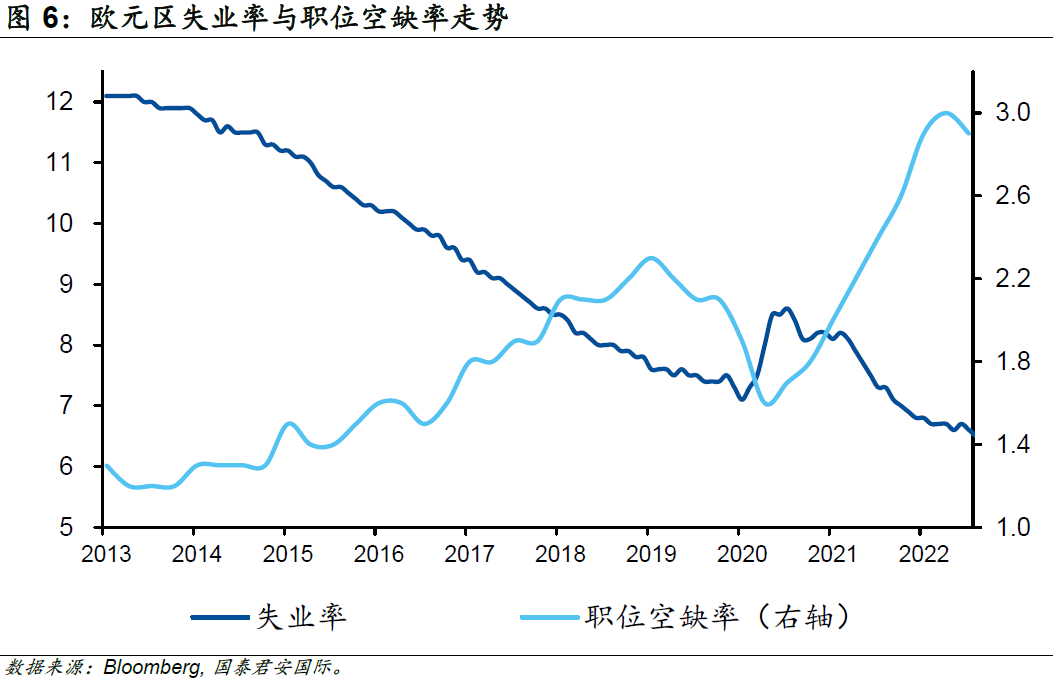 如果說天氣在很大程度上幫助了歐洲人,但歐洲經(jīng)濟超預(yù)期的根本原因大概率不是因為幸運或者天氣。進一步來看,勞動力市場的火熱意味著經(jīng)濟維持著較好的動能。一方面,即使在能源價格高企的去年上半年,職位空缺率都處于上行趨勢中;另一方面,在緊張的企業(yè)用工環(huán)境中,歐元區(qū)的失業(yè)率開始走低,并迭創(chuàng)歷史低點。在之前通脹大幅高走的背景下,歐元區(qū)多個國家的工會已經(jīng)通過罷工的形式確定了未來的漲薪方案。與此同時,歐洲央行(ECB)基于通脹補償?shù)目紤],在2022年12月的最新預(yù)測中將2022-2024年的累積工資增長較2022年9月的預(yù)測值上調(diào)1.4個百分點。