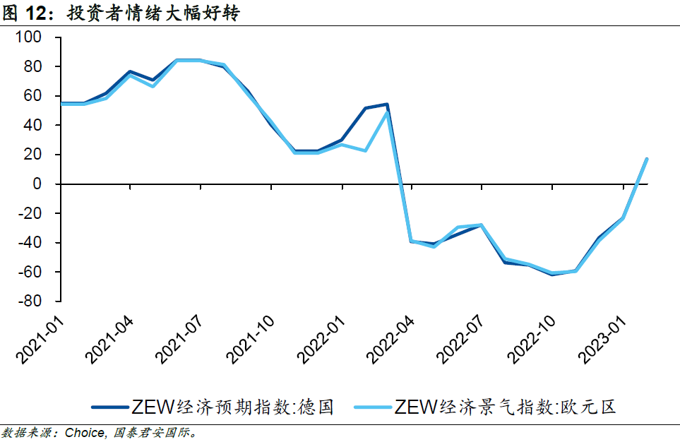 往前看,反映歐元區(qū)及德國投資者情緒的指標“ZEW經(jīng)濟景氣指數(shù)”大幅好轉(zhuǎn)。在能源問題好轉(zhuǎn)、中國經(jīng)濟向好的背景下,能源密集型企業(yè)及出口型企業(yè)的盈利預(yù)期也開始上修,2023年1月德國ZEW經(jīng)濟景氣指數(shù)錄得16.9,遠超預(yù)期值-15及前值-23.3。