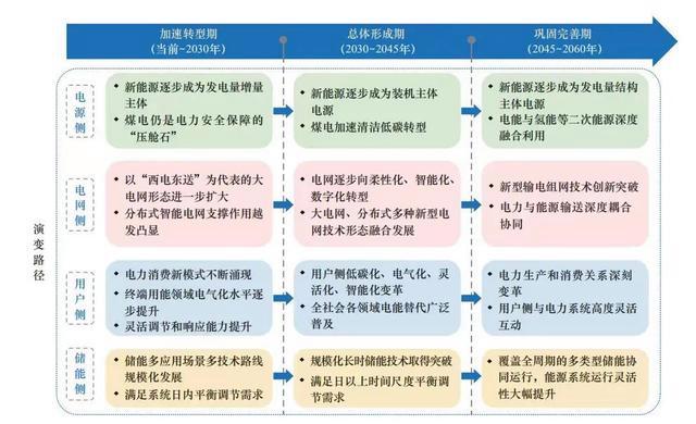 《藍(lán)皮書》指出,以2030年、2045年、2060年為新型電力系統(tǒng)構(gòu)建戰(zhàn)略目標(biāo)的重要時(shí)間節(jié)點(diǎn),制定新型電力系統(tǒng)“三步走”發(fā)展路徑,即加速轉(zhuǎn)型期(當(dāng)前至2030年)、總體形成期(2030年至2045 年)、鞏固完善期(2045年至2060年),有計(jì)劃、分步驟推進(jìn)新型電力系統(tǒng)建設(shè)的“進(jìn)度條”。