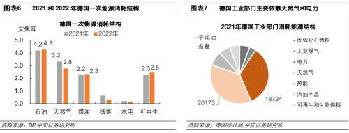 近年來德國一次能源消費(fèi)震蕩走低,2022年德國天然氣消費(fèi)量下降15.2%,工業(yè)部門對天然氣的依賴度較高。2017年以來,德國一次能源消耗量逐步減少。2021年疫后需求復(fù)蘇,德國一次能源消耗量增長3.2%,消耗12.8艾焦耳。2022年德國一次能源消費(fèi)量下降3.8%,降至12.3艾焦耳。天然氣是德國第二大一次能源消費(fèi)來源,2021年德國消費(fèi)3.3艾焦耳天然氣,占總消費(fèi)能源的25.8%。根據(jù)IEA統(tǒng)計,德國天然氣60%依賴俄羅斯供給。受供給沖擊影響,2022年德國天然氣消費(fèi)量同比下降15.2%,從3.3艾焦耳降至2.8艾焦耳,同時可再生能源、煤炭和石油消費(fèi)量分別提升了8.7%、4.5%和2.4%,一定程度上彌補(bǔ)了天然氣供應(yīng)不足帶來的能源消費(fèi)缺口。德國工業(yè)部門對天然氣和電力能源需求的依賴度較高,2021年德國工業(yè)部門能源消費(fèi)中,天然氣為20173千噸油當(dāng)量,占比36.9%;電力為18724千噸油當(dāng)量,占比34.3%。