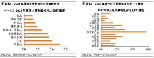 德國電力消耗密集型行業(yè)主要是紙制品、化工、基本金屬和非金屬制品等,也是工業(yè)品價格通脹較嚴(yán)重的行業(yè)。將行業(yè)電力消耗規(guī)模比上行業(yè)總產(chǎn)出,可以得到該行業(yè)的電力消耗密集度。德國紙制品行業(yè)的電力密集程度較高,每1歐元的產(chǎn)出需要投入0.51KWh的電力,化工、基本金屬和非金屬制品行業(yè)的電力密集度分別為0.4、0.36和0.33KWh/歐元。使用歐元區(qū)主要制造業(yè)PPI同比增速來衡量德國制造業(yè)的通脹形勢,可以看到2022年P(guān)PI同比最高的是焦炭和石油行業(yè),漲幅高達(dá)56.7%;電力消耗密集度較高的紙制品、化工、基本金屬和非金屬制品行業(yè)通脹程度也較高,其PPI同比分別為26.6%、29.9%、26.6%和16.7%。