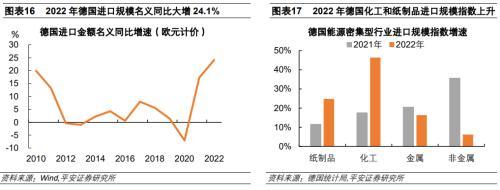 德國通過大量進(jìn)口能源密集型產(chǎn)品來彌補(bǔ)本國產(chǎn)能缺口,體現(xiàn)為2022年德國化工品和紙制品進(jìn)口規(guī)模指數(shù)大幅上升。2011年以來,德國進(jìn)口規(guī)模較為穩(wěn)定。2021年德國進(jìn)口規(guī)模增長17.3%,2022年德國進(jìn)口規(guī)模大幅增長24.1%。從能源密集型行業(yè)來看,剔除價格因素后,2022年化工和紙制品進(jìn)口規(guī)模指數(shù)大幅上升,分別增長46.4%和24.8%,金屬和非金屬2022年進(jìn)口增速則低于2021年增速。