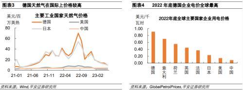 橫向比較來看,德國天然氣價格在主要工業(yè)國家中處于較高水平,德國企業(yè)電力價格在2022年底全球最高。主要工業(yè)大國中,德國和日本在天然氣供給方面較為相似,二者的天然氣價格走勢十分接近,在2022年中天然氣價格大幅攀升,并于近期價格出現(xiàn)了回落。但中美的天然氣價格則較為穩(wěn)定,德國天然氣價格在2022年8月最高峰時分別是美國和中國天然氣價格的8倍和16倍。德國電力價格在2022年底達(dá)到了全球最高的0.91美元/千瓦時,遠(yuǎn)高于日本、美國和中國0.23、0.15和0.09美元/千瓦時的電價。這引發(fā)市場對于德國制造業(yè)發(fā)展高度的擔(dān)憂。
