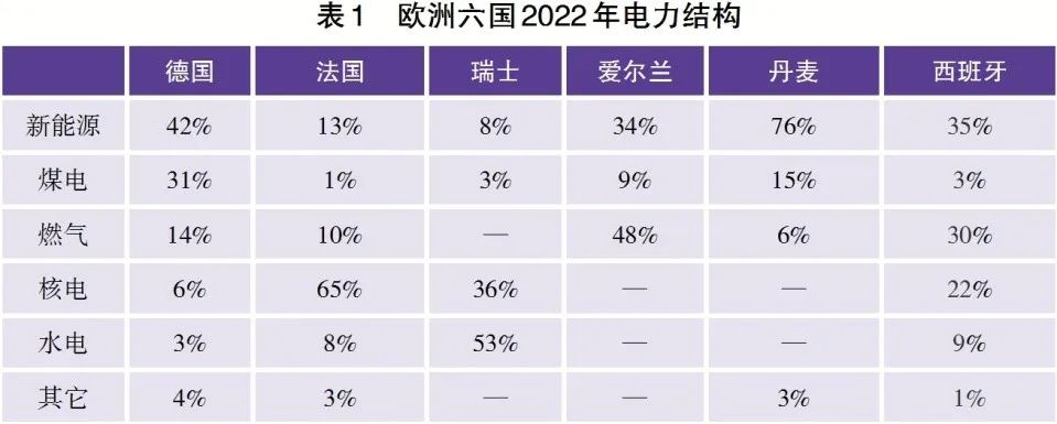 負(fù)電價(jià)主要在風(fēng)電和光伏發(fā)電高峰期出現(xiàn)。盡管發(fā)電總量已經(jīng)過剩,并引起了負(fù)電價(jià)現(xiàn)象,許多電廠仍然在持續(xù)發(fā)電,但背后的原因是多種多樣的。主要涉及三個(gè)關(guān)鍵因素:首先,電廠的應(yīng)變能力有限,難以適應(yīng)可再生能源的波動(dòng)性,還與能源結(jié)構(gòu)和電網(wǎng)結(jié)構(gòu)相關(guān)。其次,為了保持電網(wǎng)穩(wěn)定,調(diào)頻備用電廠不能輕易中止運(yùn)行,反映了電廠應(yīng)變能力方面的短板。最后,可再生能源的補(bǔ)貼政策未能精準(zhǔn)契合市場需求,這既涉及到需求層面,也與政策適應(yīng)性相關(guān)。從某種程度上來說,都或多或少地與發(fā)電機(jī)組和政策機(jī)制的靈活性相關(guān)。負(fù)電價(jià)的表現(xiàn)因各國情況而異,但均與各國的能源結(jié)構(gòu)和電網(wǎng)結(jié)構(gòu)及其演變有密切的聯(lián)系。(歐洲各國電力結(jié)構(gòu)見表1)