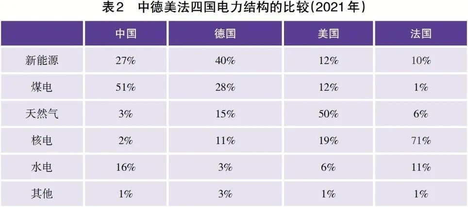 從表2中可以看出,中國與德國的電力結(jié)構(gòu)有更多的相似之處,主要都是可再生能源與煤電占比較高。而美國主要依賴天然氣發(fā)電,法國則以核電為主。因此,德國的實(shí)踐經(jīng)驗(yàn)對于中國可能會具有更高的參考價(jià)值。
