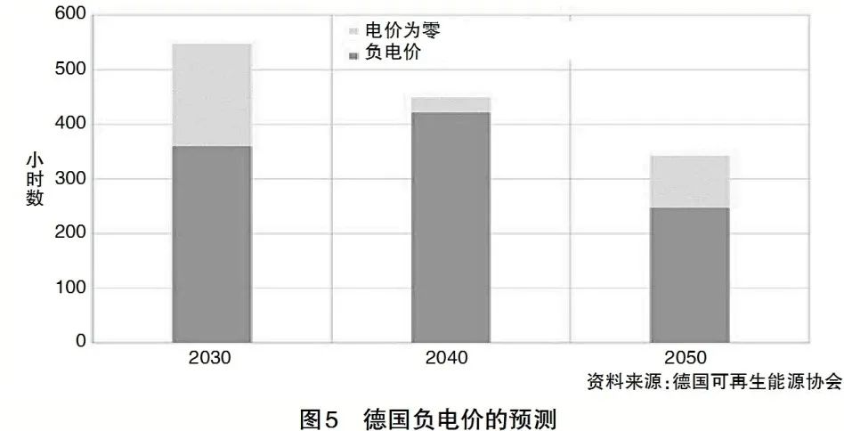 然而,負(fù)電價(jià)問題在德國能源市場中仍然持續(xù)存在。盡管德國對傳統(tǒng)電廠進(jìn)行了系統(tǒng)化靈活性改造,但按照德國可再生能源協(xié)會的預(yù)測,到2030年德國仍將面臨300多小時(shí)的負(fù)電價(jià)情況,且這種狀況有可能直到2050年仍將維持在相同的水平(詳見圖5),主要原因是能源系統(tǒng)的靈活性仍未能達(dá)到要求,盡管預(yù)期將有大規(guī)模的儲能和靈活負(fù)荷投入使用。