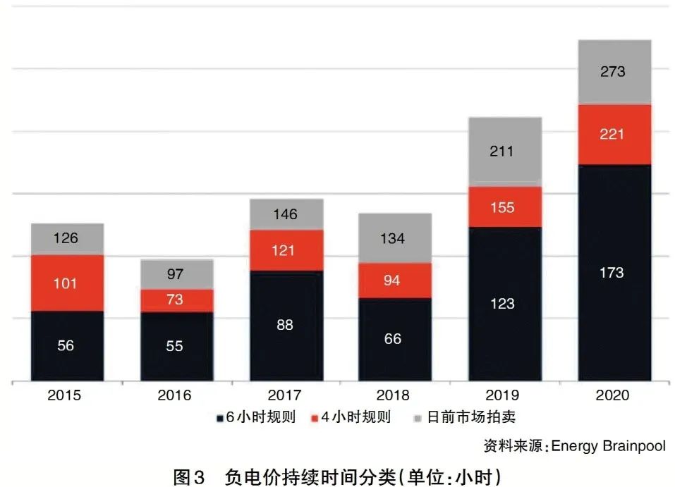 德國的研究發(fā)現(xiàn),負(fù)電價(jià)以持續(xù)6小時(shí)居多。因此,德國政府制定了相應(yīng)的限制措施,例如,如果現(xiàn)貨市場價(jià)格出現(xiàn)長達(dá)6小時(shí)或更長時(shí)間的負(fù)電價(jià),可再生能源的市場及管理補(bǔ)貼將會被取消。而法國對于負(fù)電價(jià)持續(xù)的時(shí)間上限規(guī)定則是20小時(shí)。(見圖3)