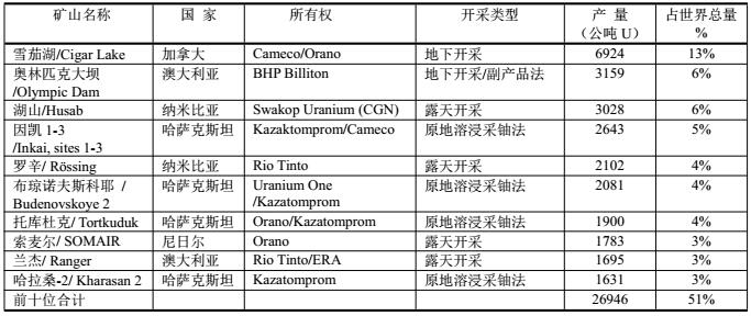 2018年世界十大鈾礦占據(jù)了全球總產(chǎn)量的51%。雖然加拿大雪茄湖居產(chǎn)量之首,但哈薩克斯坦占了4席。