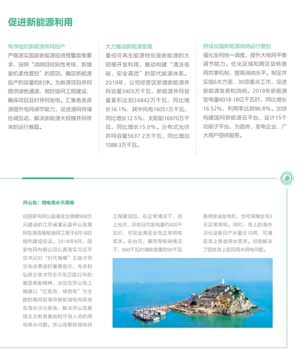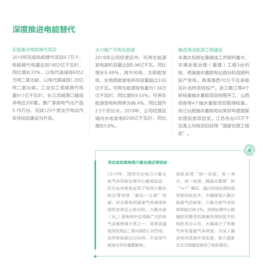 在努力做綠色發(fā)展的表率方面,國家電網(wǎng)有限公司認(rèn)真貫徹落實綠色發(fā)展理念,全力推進生態(tài)文明建設(shè),推動能源更高質(zhì)量、更可持續(xù)發(fā)展,以綠色低碳高效的充足電能,全力服務(wù)美麗中國建設(shè)。2019年經(jīng)營區(qū)新增新能源并網(wǎng)容量3405萬千瓦,新能源并網(wǎng)容量累積達到34842萬千瓦,同比增長16.1%,新能源云平臺接入新能源場站55萬余座、裝機容量2.3億千瓦,累計交易額754.3億元,帶動產(chǎn)業(yè)鏈上下游3000余家企業(yè)協(xié)同發(fā)展;完成電能替代項目9.7萬個,電能替代電量達到1802億千萬時,“煤改電”配套電網(wǎng)建設(shè)惠及19684個村、372萬戶居民,以電代油減排二氧化碳6052萬噸,以電代煤減排二氧化碳1.20億噸;智慧車聯(lián)網(wǎng)平臺累計接入充電樁43萬個,充電量達14.82 億千瓦時,同比增長73.86%。
