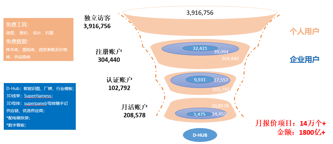 我們既然定下這個(gè)目標(biāo),就要一步一步來實(shí)施,做云端SaaS服務(wù),把原來的賣軟件的業(yè)務(wù)變成云服務(wù)。把我們?cè)瓉淼膱?bào)價(jià)軟件、設(shè)計(jì)軟件全部云端化并且共享一個(gè)數(shù)據(jù)庫(kù)。我們又做了選型軟件、生產(chǎn)安裝的軟件,目前正在開發(fā)數(shù)字看板和數(shù)字工廠,所有的這些產(chǎn)品通過D-Hub是共享同一套數(shù)據(jù)庫(kù)。我們把原來離線的產(chǎn)品都變成在線,其中一部分軟件和數(shù)據(jù)免費(fèi)為用戶服務(wù),這些免費(fèi)的軟件和內(nèi)容吸引了大量的用戶,現(xiàn)在我們的獨(dú)立訪客有390萬(wàn)。當(dāng)然我們也有收費(fèi)的產(chǎn)品D-Hub。利馳已經(jīng)從一家CAD軟件公司轉(zhuǎn)變?yōu)樵诰€服務(wù)公司,我們其中的一個(gè)在線服務(wù)——電氣工程項(xiàng)目報(bào)價(jià)——最新的數(shù)據(jù)顯示一個(gè)月可以報(bào)14萬(wàn)個(gè)項(xiàng)目,總價(jià)值約1800億。