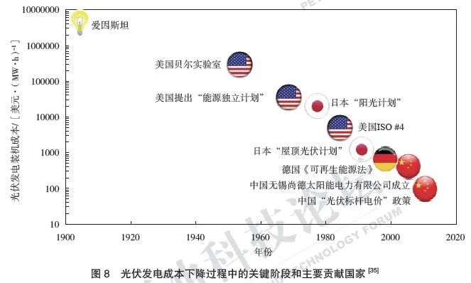 美國能源技術(shù)和公共政策學(xué)者Gregory F. Nemet于2019年出版著作《光伏如何變得便宜》(How Solar Became Cheap),書中介紹了光伏發(fā)電技術(shù)在歷史上的不同發(fā)展階段、成本變化的關(guān)鍵驅(qū)動(dòng)因素、關(guān)鍵國家對(duì)成本降低的貢獻(xiàn),以及光伏發(fā)電對(duì)其他低碳能源技術(shù)發(fā)展的經(jīng)驗(yàn)?zāi)P?。光伏發(fā)電的4個(gè)關(guān)鍵階段為:(1)20世紀(jì)50—70年代美國早期實(shí)驗(yàn)室研究,推動(dòng)每兆瓦時(shí)的裝機(jī)成本從10萬美元級(jí)降到1萬美元級(jí);(2)20世紀(jì)90年代的日本“屋頂光伏計(jì)劃”,推動(dòng)每兆瓦時(shí)裝機(jī)成本降至1000美元級(jí);(3)21世紀(jì)初德國《可再生能源法》的發(fā)布實(shí)施,推動(dòng)裝機(jī)成本降至1000美元/(MW·h)以下;(4)中國以“光伏標(biāo)桿電價(jià)”等強(qiáng)力政策推動(dòng)產(chǎn)業(yè)發(fā)展,促進(jìn)裝機(jī)成本降至100美元/(MW·h)以內(nèi)(圖8)。