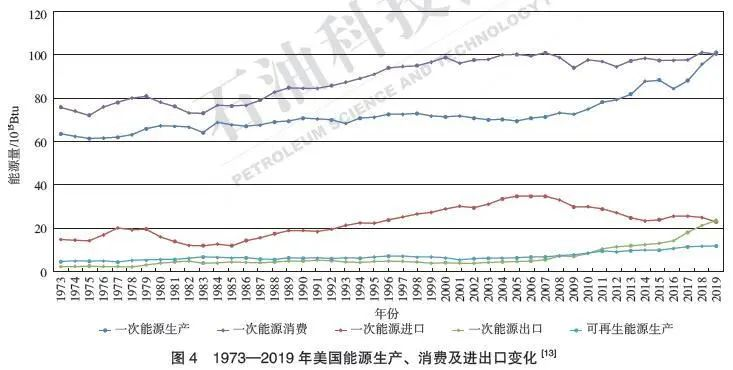 與歐洲的高比例可再生能源、激進(jìn)的碳減排目標(biāo)政策不同,美國能源轉(zhuǎn)型是在實(shí)現(xiàn)“能源獨(dú)立”的前提下推動(dòng)能源系統(tǒng)清潔化,以增加清潔能源(包括核電、可再生能源、天然氣和潔凈煤等)應(yīng)用比例為主要手段。2000年,美國和德國化石能源占一次能源消費(fèi)總量的比例分別是85%和88. 6%,從這一角度來看兩國能源轉(zhuǎn)型起點(diǎn)相似;2018年,美國和德國可再生能源在一次能源消費(fèi)量中所占比例分別為11.4%和16.6%,德國略勝一籌??v觀1973年以來美國的能源生產(chǎn)、消費(fèi)和進(jìn)出口情況,自2005年起,美國可再生能源和核電產(chǎn)量快速增長,清潔能源消費(fèi)比例加速上升;2010以來,一次能源產(chǎn)量快速增長,并在2019年實(shí)現(xiàn)了“能源獨(dú)立”(圖4)。