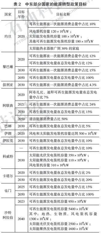 21世紀(jì)以來,全球能源格局發(fā)生重大變化,以美國頁巖氣革命為代表的非常規(guī)油氣開采量爆發(fā)式增長,可再生能源產(chǎn)業(yè)高速發(fā)展,全球能源消費(fèi)中心不斷向發(fā)展中國家轉(zhuǎn)移。這些因素促使中東國家對(duì)后石油時(shí)代進(jìn)行戰(zhàn)略思考。近年來,推進(jìn)能源轉(zhuǎn)型、擴(kuò)大可再生能源應(yīng)用比例逐步進(jìn)入政府部門的視野,沙特阿拉伯、阿聯(lián)酋、卡塔爾、科威特等國相繼制定了多項(xiàng)政策目標(biāo)(表2)。