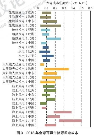 第三,可再生能源大規(guī)模開發(fā)利用。風(fēng)力發(fā)電和太陽能光伏發(fā)電成為全球成本下降最快、平均成本最低的可再生能源發(fā)電方式。2018年,除海上風(fēng)電以外,全球各地多種可再生能源發(fā)電技術(shù)的成本開始具備較強(qiáng)的成本競爭力(圖3)。在許多國家和地區(qū),可再生能源已開始了對(duì)化石能源發(fā)電的存量替代。中國是世界上可再生能源利用規(guī)模最大、平均成本最低的國家,從2014年開始,每年的風(fēng)電和太陽能發(fā)電量均超過全社會(huì)新增用電量。