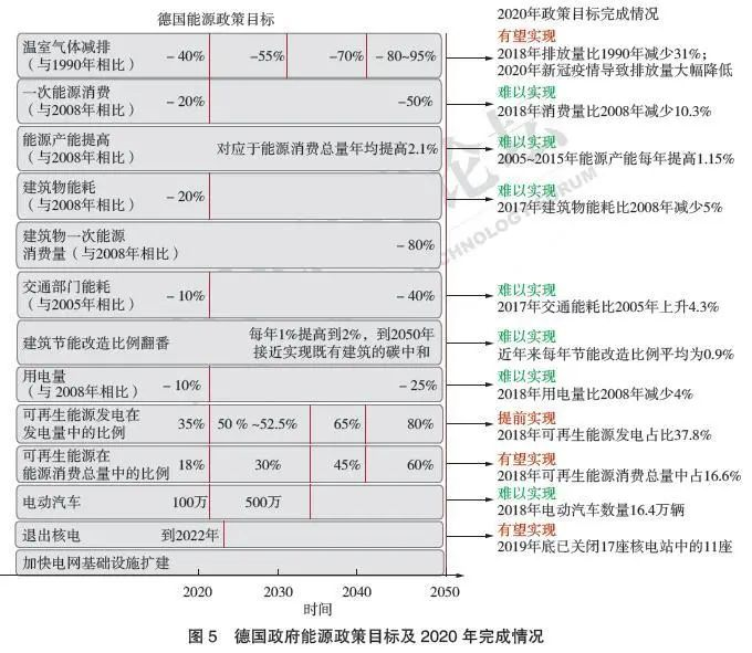 德國能源資源稟賦不佳,除了煤炭儲(chǔ)量相對(duì)豐富外,石油和天然氣高度依賴進(jìn)口。德國能源轉(zhuǎn)型實(shí)踐始于21世紀(jì)初,確立了“能源安全、經(jīng)濟(jì)效率和環(huán)境可承受”的能源政策三大目標(biāo),核心思想是可持續(xù)發(fā)展。2000年,德國出臺(tái)《可再生能源法》,確定了可再生能源發(fā)展的多項(xiàng)激勵(lì)措施,并分別在2004年、2009年、2012年、2014年針對(duì)實(shí)際情況做出修訂和調(diào)整。2014年底,德國頒布《國家能效行動(dòng)計(jì)劃》,對(duì)能源消費(fèi)總量、建筑能效和交通能效等提出行動(dòng)目標(biāo)。考察2020年之前所完成的半數(shù)轉(zhuǎn)型目標(biāo),與其他國家相比,德國是能源轉(zhuǎn)型的“優(yōu)等生”(圖5)。