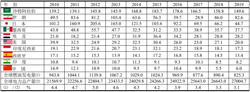 2010~2019年前十位國(guó)家燃油發(fā)電(單位:TWh)