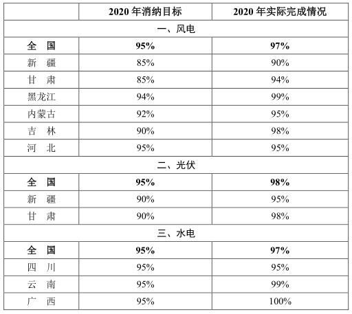 根據(jù)2018年國家發(fā)展改革委、國家能源局印發(fā)的《清潔能源消納行動(dòng)計(jì)劃(2018-2020年)》(發(fā)改能源規(guī)〔2018〕1575號(hào)),所確定的分年度風(fēng)電、光伏和水電消納目標(biāo),2020年全國平均風(fēng)電利用率97%,超過2020年風(fēng)電利用率目標(biāo)2個(gè)百分點(diǎn),重點(diǎn)省區(qū)全部達(dá)到了2020年消納目標(biāo);全國平均光伏發(fā)電利用率為98%,超過2020年利用率目標(biāo)3個(gè)百分點(diǎn),重點(diǎn)省區(qū)全部達(dá)到了2020年消納目標(biāo);全國主要流域水能利用率97%,超過2020年利用率目標(biāo)近2個(gè)百分點(diǎn),重點(diǎn)省區(qū)全部達(dá)到了2020年消納目標(biāo)。