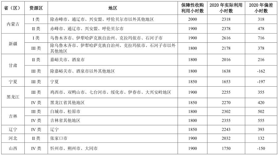 表3 2020年風(fēng)電重點(diǎn)地區(qū)最低保障收購年利用小時(shí)數(shù)落實(shí)情況