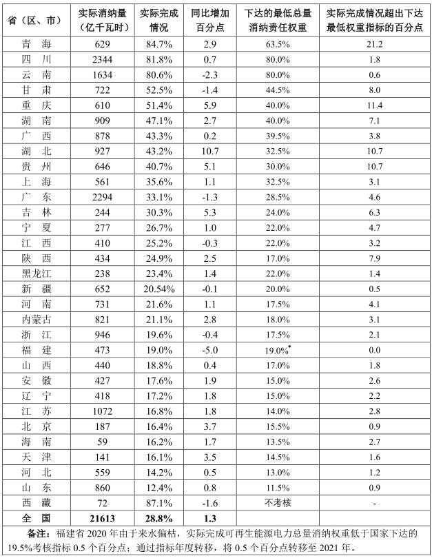 根據(jù)《國家發(fā)展改革委 國家能源局關(guān)于印發(fā)各省級(jí)行政區(qū)域2020年可再生能源電力消納責(zé)任權(quán)重的通知》(發(fā)改能源〔2020〕767號(hào))公布的2020年各省(區(qū)、市)可再生能源電力消納責(zé)任權(quán)重,綜合考慮各省本地生產(chǎn)、本地利用以及外來電力消納情況,經(jīng)核算,除西藏免除考核外,全國30個(gè)省(區(qū)、市)都完成了國家能源主管部門下達(dá)的總量消納責(zé)任權(quán)重和非水電消納責(zé)任權(quán)重。