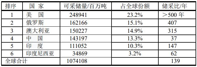 全球原煤可采儲量前6位國家的產(chǎn)量(單位:百萬噸)