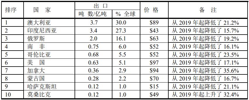 2020年煤出口國有50位,占全球出口煤量的99.6%。