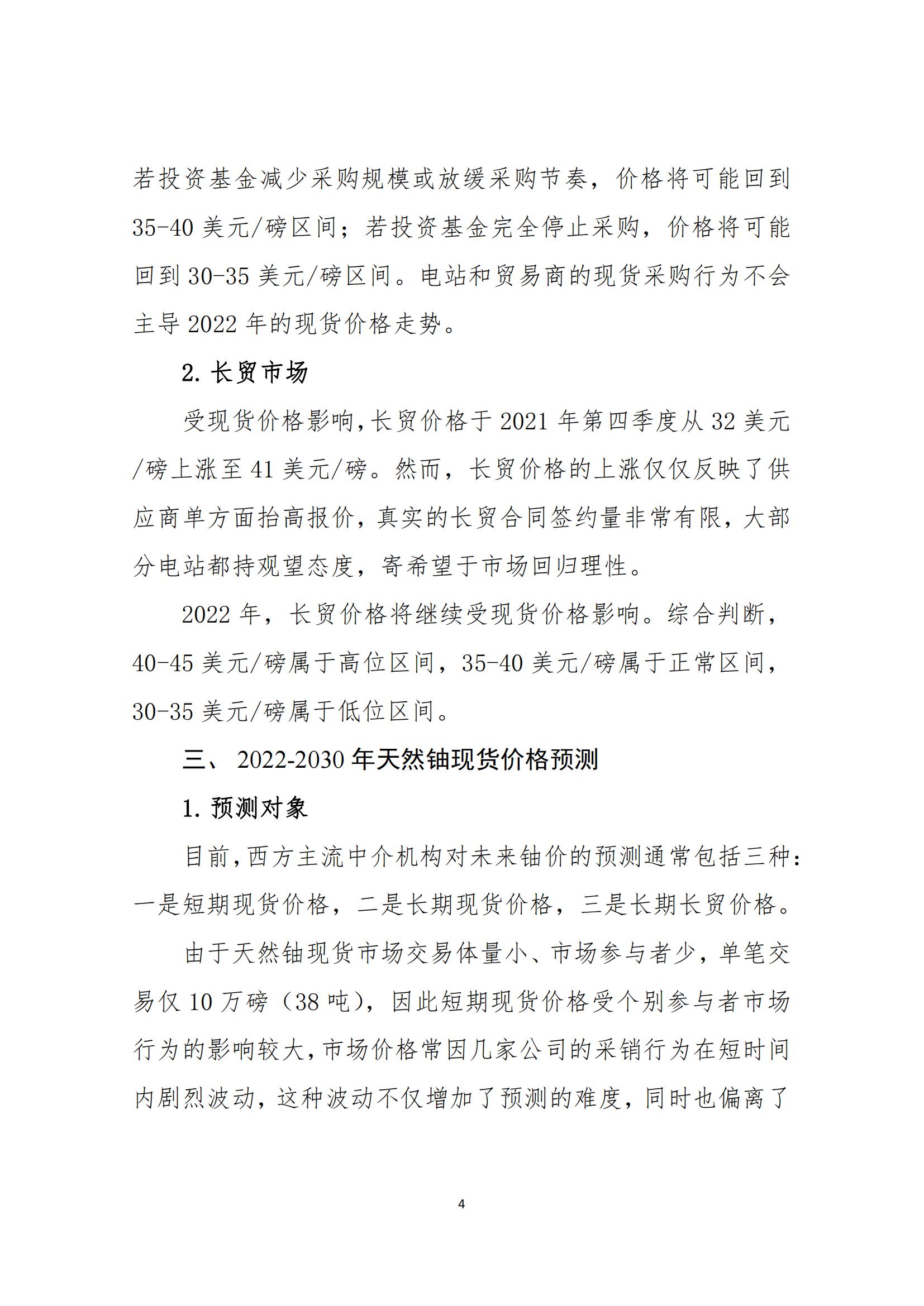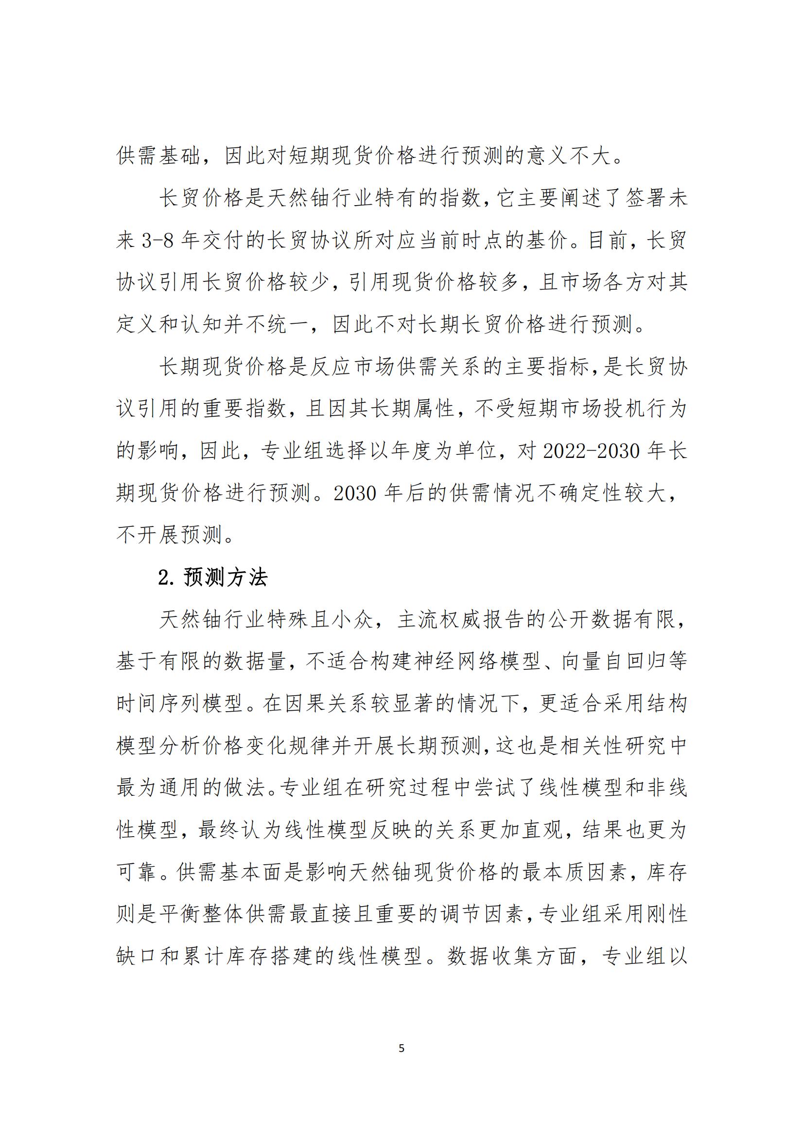 報告還對2022-2030年天然鈾現(xiàn)貨價格作了預(yù)測。之所以選擇對長期現(xiàn)貨價格進行預(yù)測,是因為該價格是反應(yīng)市場供需關(guān)系的主要指標,是長貿(mào)協(xié)議引用的重要指數(shù),且不易受到短期市場投機行為的影響。
