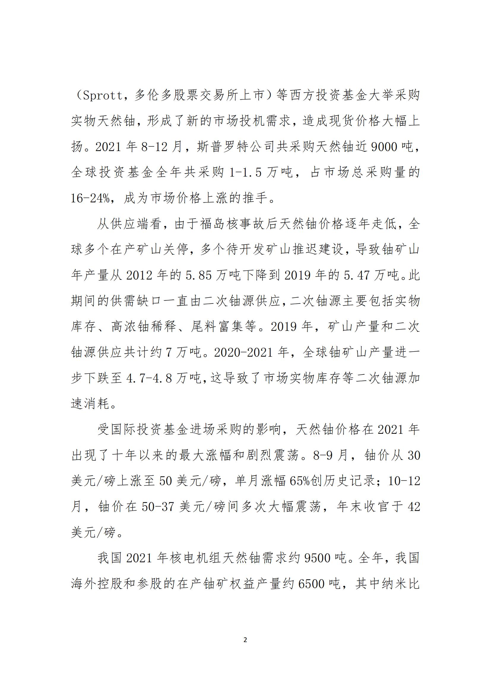 報告認為,2021年的全球天然鈾市場,仍供大于求,但正逐步趨于平衡。值得注意的是,2018年以來,黃餅公司(Yellow Cake,倫敦股票交易所上市)和斯普羅特公司(Sprott,多倫多股票交易所上市)等西方投資基金大舉采購實物天然鈾,形成了新的市場投機需求,造成現(xiàn)貨價格大幅上揚。8-9月,鈾價從30美元/磅上漲至50美元/磅,單月漲幅65%創(chuàng)歷史記錄;10-12月,鈾價在50-37美元/磅間多次大幅震蕩,年末收官于42美元/磅。我國海外鈾礦權(quán)益產(chǎn)品為核電天然鈾供應(yīng)提供了有力保障,并在國際大宗商品價格大幅上漲的背景下,有效抑制了天然鈾價格上漲,很好地發(fā)揮了保供穩(wěn)價作用。