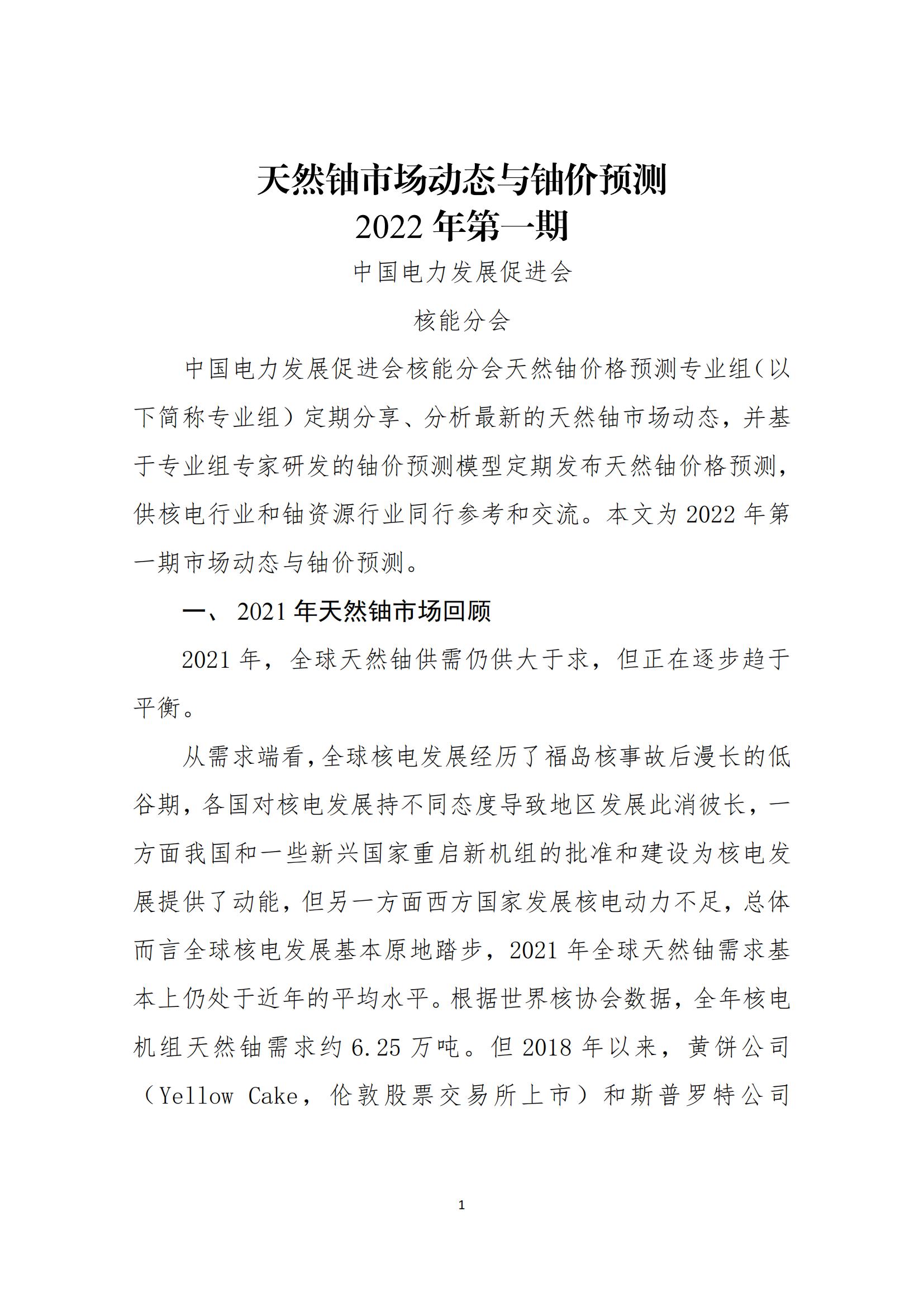 2022年2月7日,虎年春節(jié)后第一個工作日,由中國電力發(fā)展促進會核能分會編制的2022年第一期天然鈾價格預(yù)測報告發(fā)布,電力網(wǎng)獲悉,今后報告將每季度發(fā)布一次,一年四期。