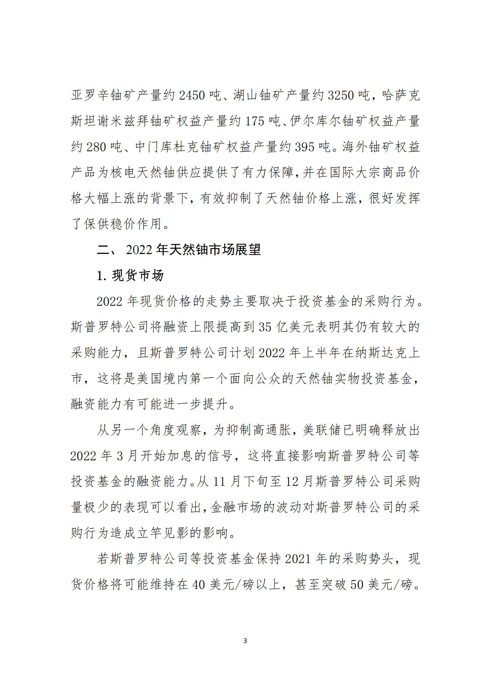 對2022年天然鈾市場的情況,報告作了如下展望?,F(xiàn)貨市場方面,2022年現(xiàn)貨價格的走勢主要取決于投資基金的采購行為。美聯(lián)儲已明確釋放出2022年3月開始加息的信號,若斯普羅特公司等投資基金保持2021年的采購勢頭,現(xiàn)貨價格將可能維持在40美元/磅以上,甚至突破50美元/磅;若投資基金減少采購規(guī)模或放緩采購節(jié)奏,價格將可能回到35-40美元/磅區(qū)間;若投資基金完全停止采購,價格將可能回到30-35美元/磅區(qū)間。長貿(mào)市場方面,長貿(mào)價格將繼續(xù)受現(xiàn)貨價格影響,綜合判斷,40-45美元/磅屬于高位區(qū)間,35-40美元/磅屬于正常區(qū)間,30-35美元/磅屬于低位區(qū)間。