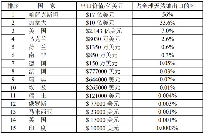 2020年出口價(jià)值最高的天然鈾的15個(gè)國家,這15個(gè)國家出口天然鈾占總量的99.999%。