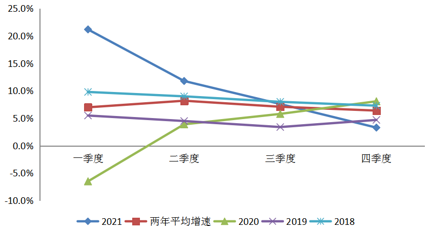 主要受到經(jīng)濟(jì)持續(xù)穩(wěn)定恢復(fù)和二產(chǎn)用電增長的拉動,一季度全社會用電量較快增長,拉動全年用電量同比增長4.5個百分點,較2019年同期增長14.4%。受能耗雙控和堅決遏制“兩高”項目盲目發(fā)展政策、同期基數(shù)抬升等因素影響,季度用電增速呈現(xiàn)“前高后底”態(tài)勢。通過對比可以看出,從2021年各季度兩年平均增速來看,增速略高于2019年,在2018和2019年之間。