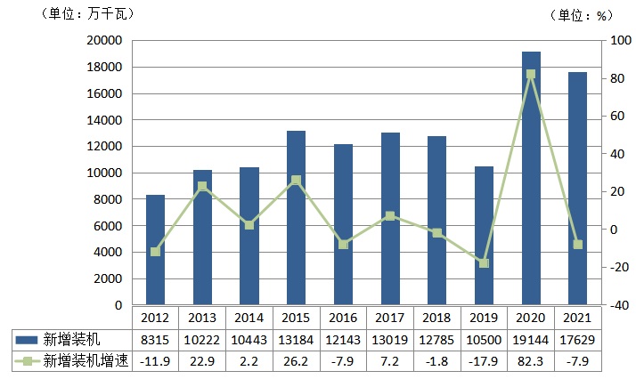 圖7 2012~2021年全國新增電力裝機(jī)及增速情況