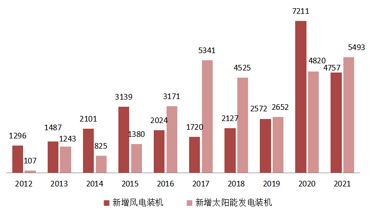 圖10 2012~2021年新增風(fēng)電、太陽能發(fā)電裝機(jī)情況(單位:萬千瓦)
