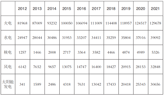 表3 2012~2021年全國電力裝機(jī)結(jié)構(gòu)(單位:萬千瓦)