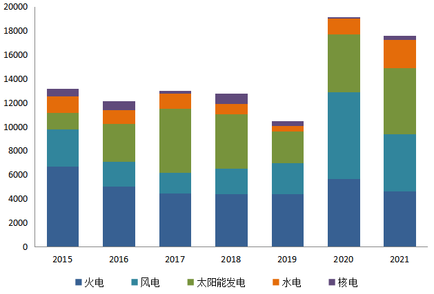 圖8 2015~2021年全國新增電力裝機(jī)結(jié)構(gòu)對比(單位:萬千瓦)