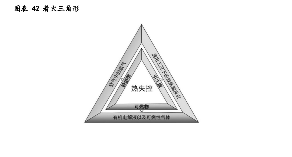 在電池系統(tǒng)熱失控蔓延無(wú)法遏制時(shí),消防滅火措施需要阻斷"著火三角形”三個(gè)要 素中的一個(gè)或多個(gè),來(lái)達(dá)到保證火災(zāi)安全的目的。合理的熱失控蔓延抑制措施需要考 慮措施的可行性。