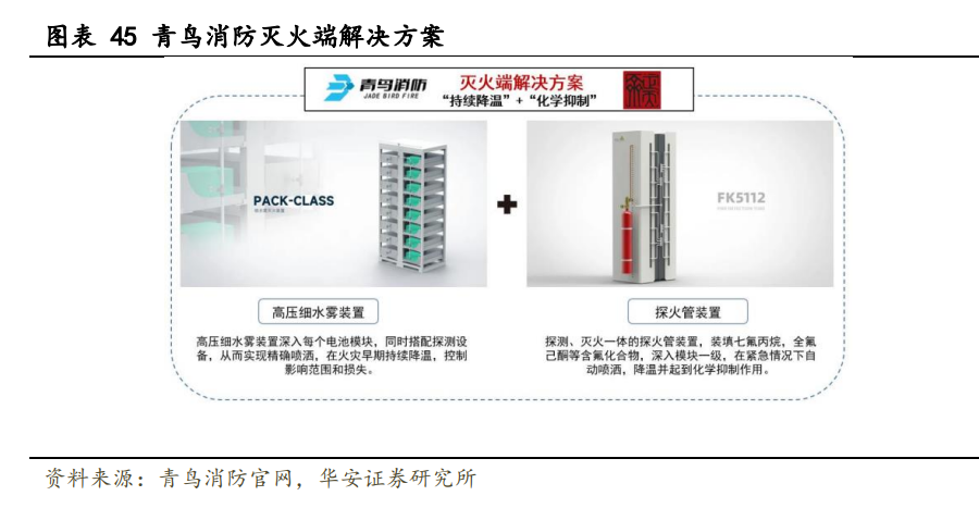 消防市場(chǎng)有望高速增長(zhǎng)。儲(chǔ)能消防市場(chǎng)規(guī)模=新增儲(chǔ)能裝機(jī)容量*儲(chǔ)能系統(tǒng)成本* 消防成本占比。隨原材料價(jià)格逐步回落與鋰電池儲(chǔ)能技術(shù)逐步提升,電化學(xué)儲(chǔ)能系統(tǒng) 成本將逐年降低,根據(jù) BNEF 測(cè)算,2025 年有望降至 1.4 元/Wh 左右。根據(jù)青鳥(niǎo)消防公告,目前消防占儲(chǔ)能系統(tǒng)成本約 3%,隨著風(fēng)光電高比例接入電網(wǎng),儲(chǔ)能利用率將 快速提升,進(jìn)而帶來(lái)更旺盛的消防需求,相應(yīng)消防成本占比逐年提升。儲(chǔ)能消防目前 單站價(jià)值量較低,行業(yè)未形成統(tǒng)一標(biāo)準(zhǔn)。預(yù)計(jì)隨《電化學(xué)儲(chǔ)能電站安全規(guī)程》正式稿 的出臺(tái),將有效帶動(dòng)行業(yè)規(guī)范發(fā)展,提升儲(chǔ)能消防產(chǎn)品質(zhì)量與數(shù)量,行業(yè)有望迎來(lái)供 需兩端同步改善。 國(guó)安達(dá):國(guó)安達(dá)為國(guó)內(nèi)特種消防龍頭,在滅火劑、驅(qū)動(dòng)劑、產(chǎn)品結(jié)構(gòu)等方面擁有 多項(xiàng)核心技術(shù)。近年來(lái)公司解決了新能源汽車(chē)鋰電池箱、特高壓換流站等特殊領(lǐng)域的 消防難題,并前瞻性布局電化學(xué)儲(chǔ)能消防產(chǎn)品。 國(guó)安達(dá)與國(guó)家電網(wǎng)有堅(jiān)實(shí)的長(zhǎng)期合作基礎(chǔ),自 2012 年開(kāi)始合作,于 2019 年 12 月 研發(fā)出變壓器固定自動(dòng)滅火系統(tǒng),2020 年 10 月通過(guò)了聯(lián)合驗(yàn)收,所使用的“壓縮空 氣泡沫滅火技術(shù)”最終確定為特高壓換流站的關(guān)鍵消防配套技術(shù)。同時(shí)與國(guó)家電網(wǎng)也 建立了緊密的合作研發(fā)關(guān)系。