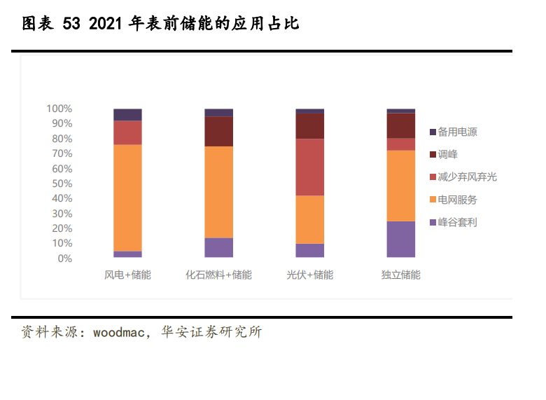 按照是否與新能源電站共址,可將儲能分為獨立儲能和新能源配儲,2020 年之前美 國表前儲能裝機(jī)以獨立儲能為主,且主要滿足功率型需求,配儲時長普遍較短,2021 年 起美國表前儲能中新能源配儲的裝機(jī)規(guī)模大幅領(lǐng)先獨立儲能。隨著越來越多光伏系統(tǒng)接 入電網(wǎng),預(yù)計能量型需求占比將提升,有望驅(qū)動表前儲能平均配儲時長提高至 4 小時。 表前儲能的主要作用為電網(wǎng)服務(wù)、峰谷套利、調(diào)峰、減少棄風(fēng)/棄光及備用電源,其 中獨立儲能主要側(cè)重于電網(wǎng)服務(wù)(50%),光伏配儲更側(cè)重于減少棄光(40%)。